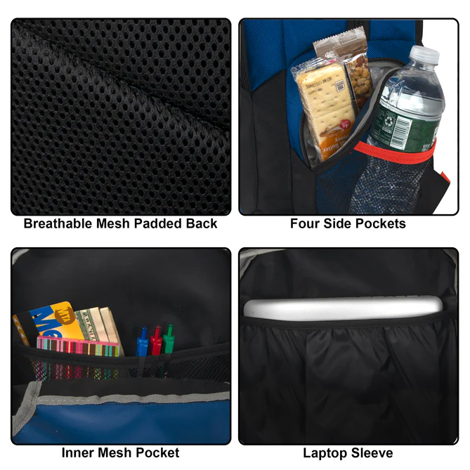 It features two super spacious main compartments, two large full front pockets, two side zippered pockets, 2 side mesh pockets, and compression buckles for easy carriage. Great for school, travel, and adventures of all kinds.