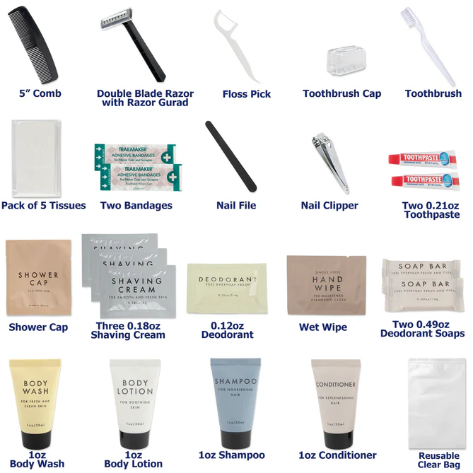 From personal grooming to refreshing showers, this kit has a comb, razor, toothbrush, tissues, and more.