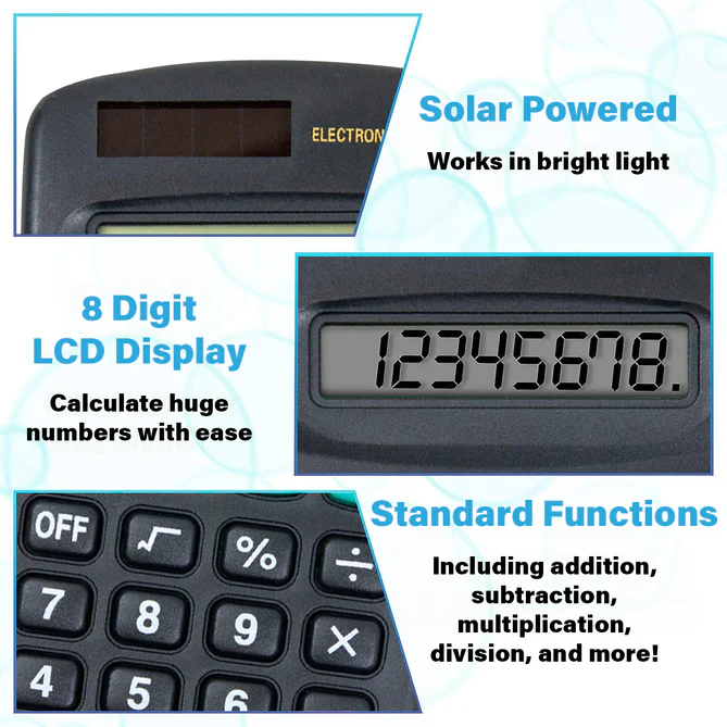 This handy pocket calculator is perfect for students and offers a large, easy-to-read print. Slender and lightweight, it takes up less space than most cell phones and tucks easily into backpacks and bags.