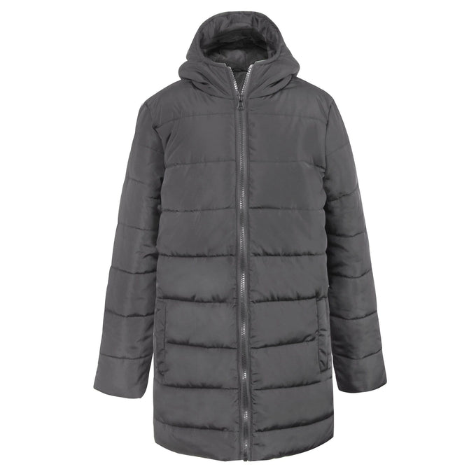Has a hood for extra warmth and wind protection and two deep pockets for additional storage or hand warmth.